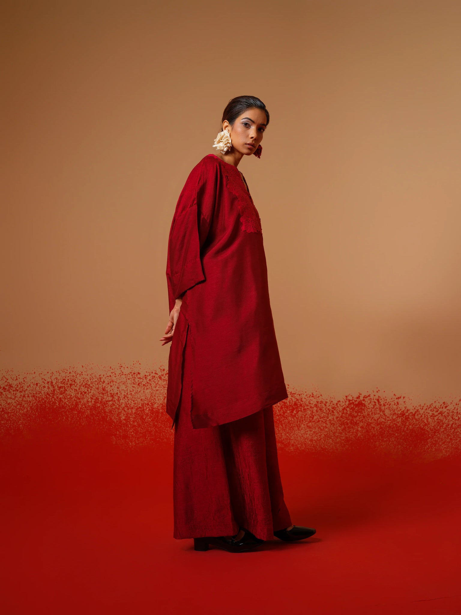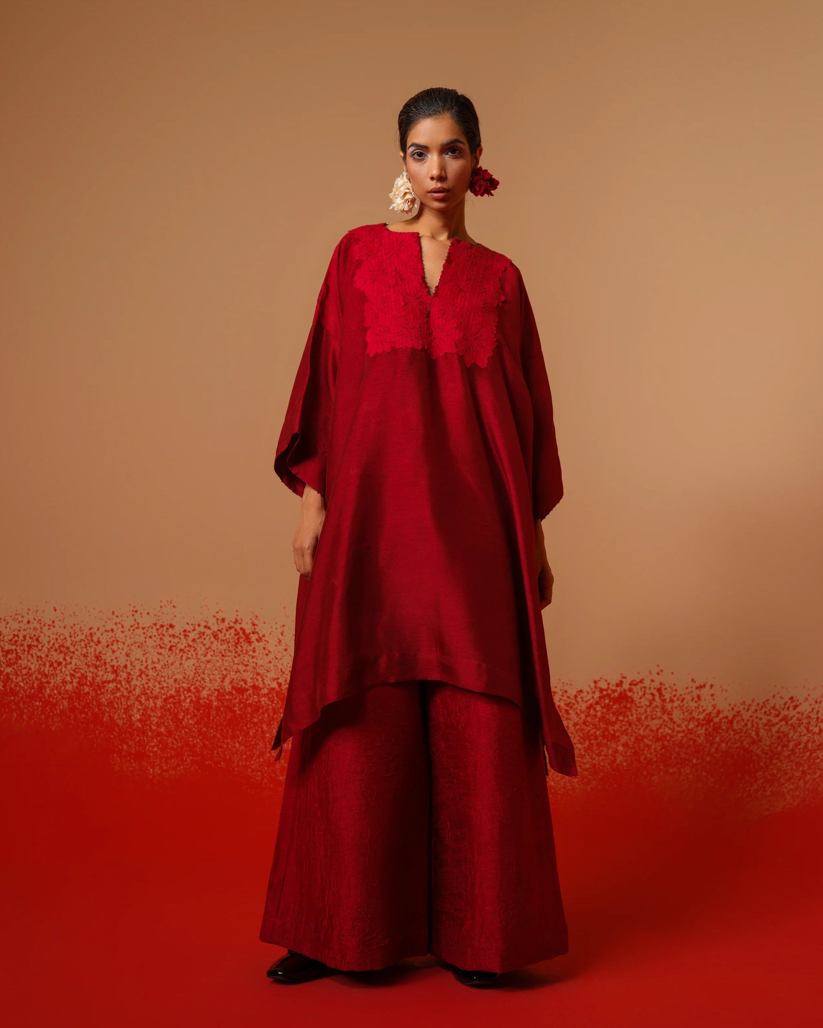A relaxed tunic cut in our signature crushed silk, elevated with delicate hand-sewn floral motifs — effortless, textured, and made for everyday poetry.Relaxed shirt style featuring a sophisticated overlap design and exquisite fabric buttons. Each piece is meticulously adorned with hand-sewn appliqué, adding a touch of artistry to your wardrobe.