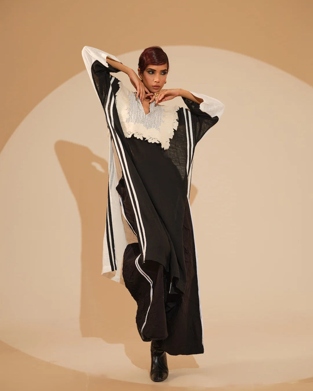 A delicately constructed tunic in crushed cotton, pieced together in two gentle shades of pink and ivory. Finished with a gilet-style overlay and hand-stitched floral motifs. The tunic is paired with hand crushed cotton trousers, featuring an elasticated waistband for ease. The trousers also feature a contrasting binding on the side seams.