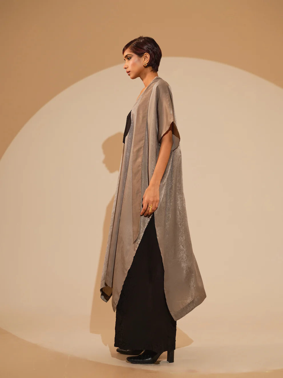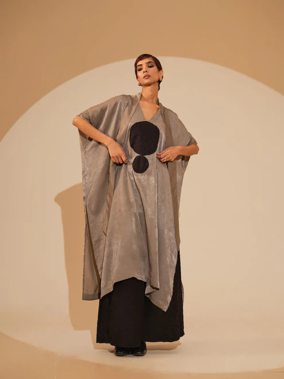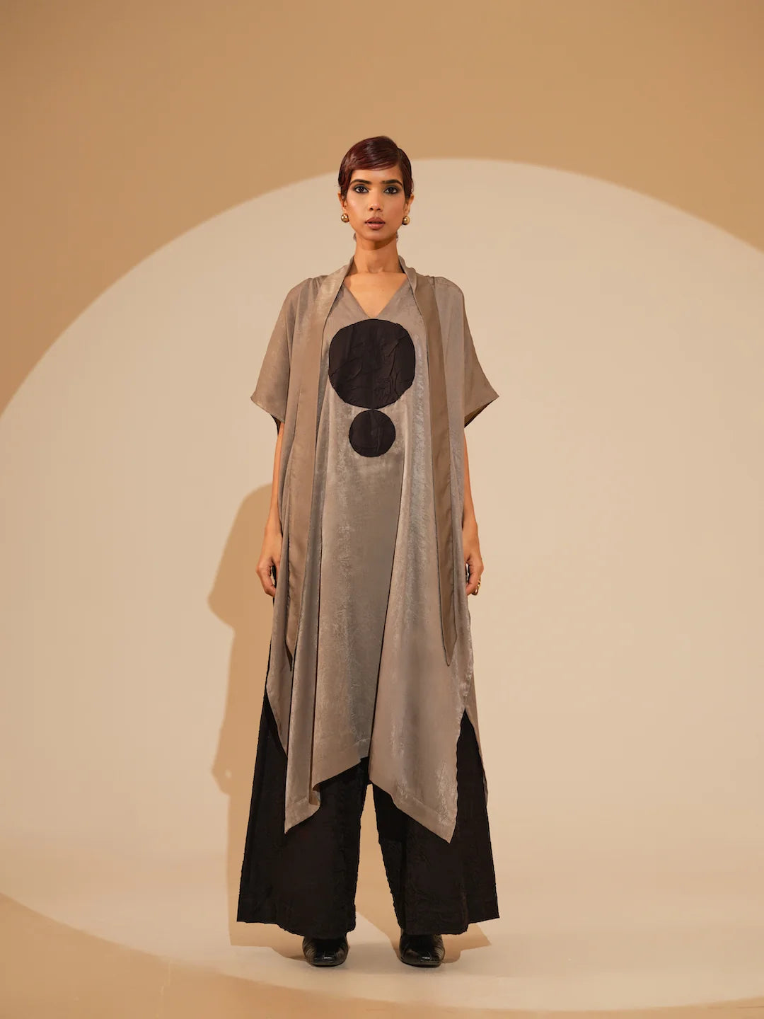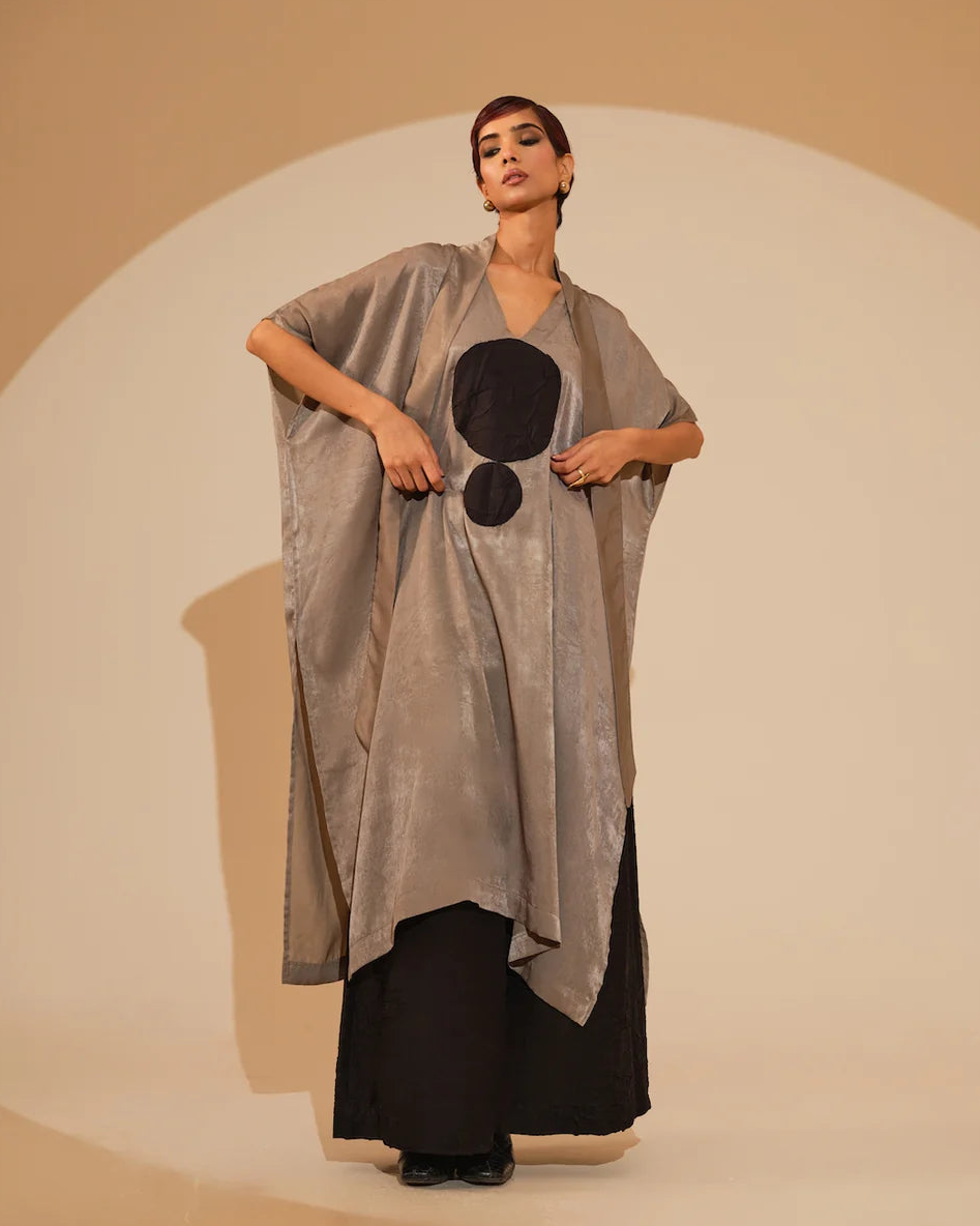A relaxed, one-size tunic crafted in a play of velvet. Accented with contrasting applique Each piece is meticulously adorned with hand-sewn appliqué, adding a touch of artistry to your wardrobe. comes with crushed silk pants.