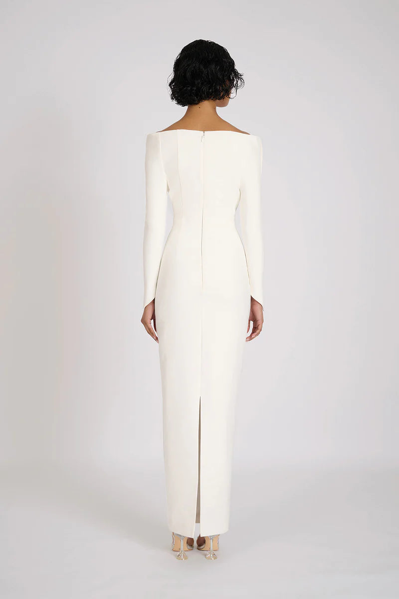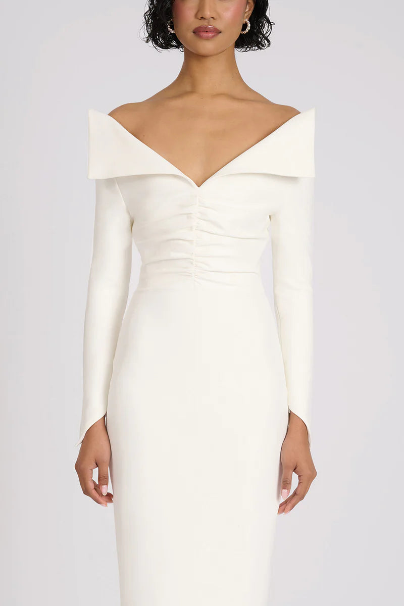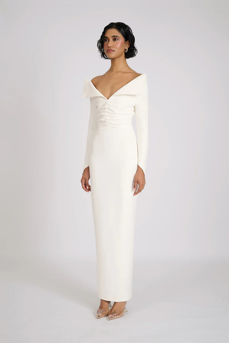 A chic and sophisticated piece designed to make a statement. This stunning dress features a unique fold-over shoulder design, adding an elegant and modern touch to its silhouette. The gathering and ruching detailing along the centre front creates a flattering shape that enhances your figure, adding both texture and visual interest. The floor length silhouette offers a timeless, versatile look, while the centre back split adds a touch of allure and movement with every step.