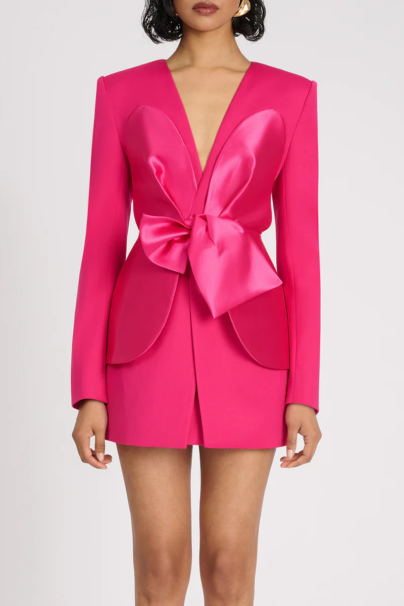 The Esther Gown is crafted from figure-hugging bandage. A floor-length gown that features a refined boat neckline and a deep cowl at the hips, creating contrast and visual interest. Boning through the waist sculpts and defines the silhouette, while a centre-back split allows for fluid movement. Designed to contour the body, Esther is a statement for formal occasions.