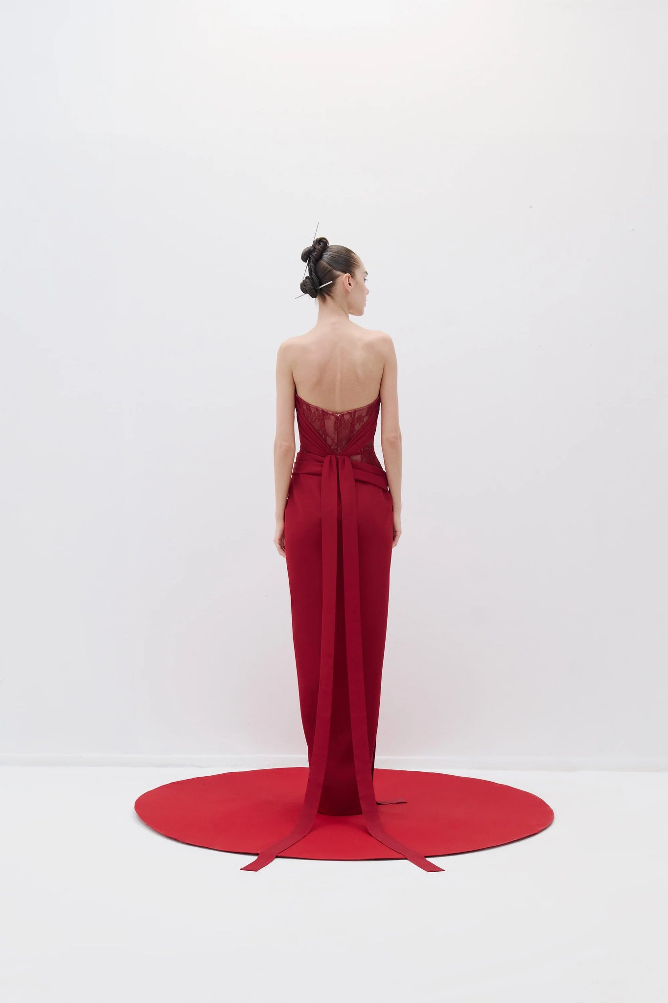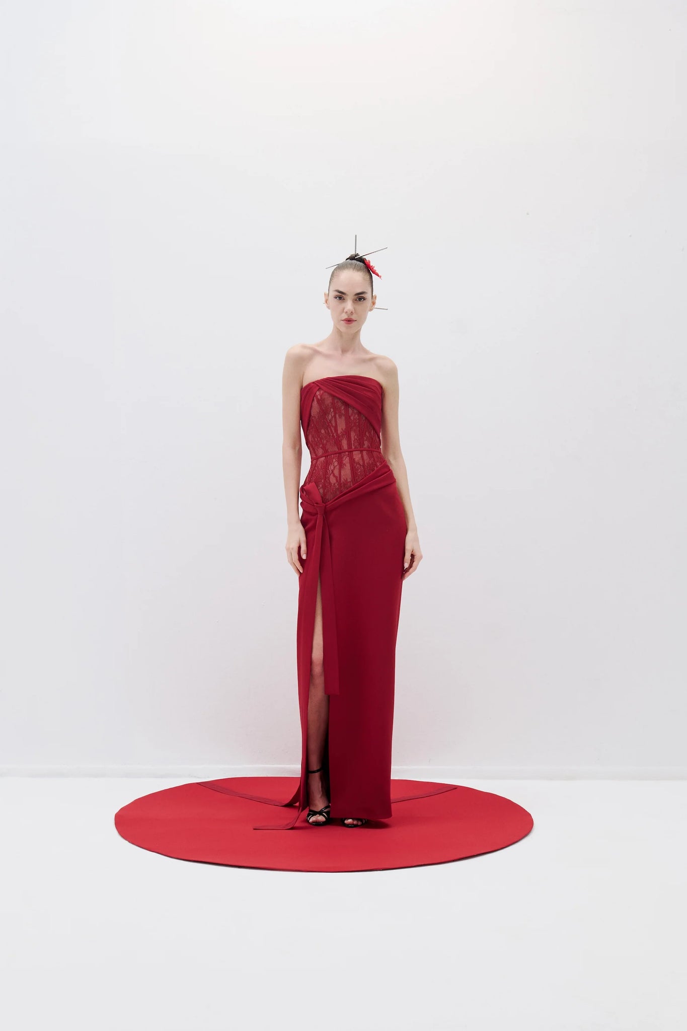 A strapless dress featuring a deep slit and structured boning. The corset section