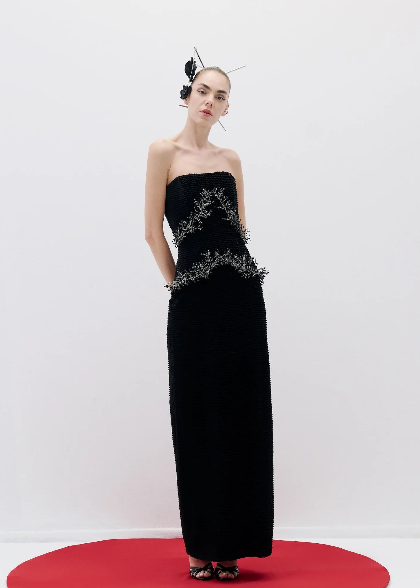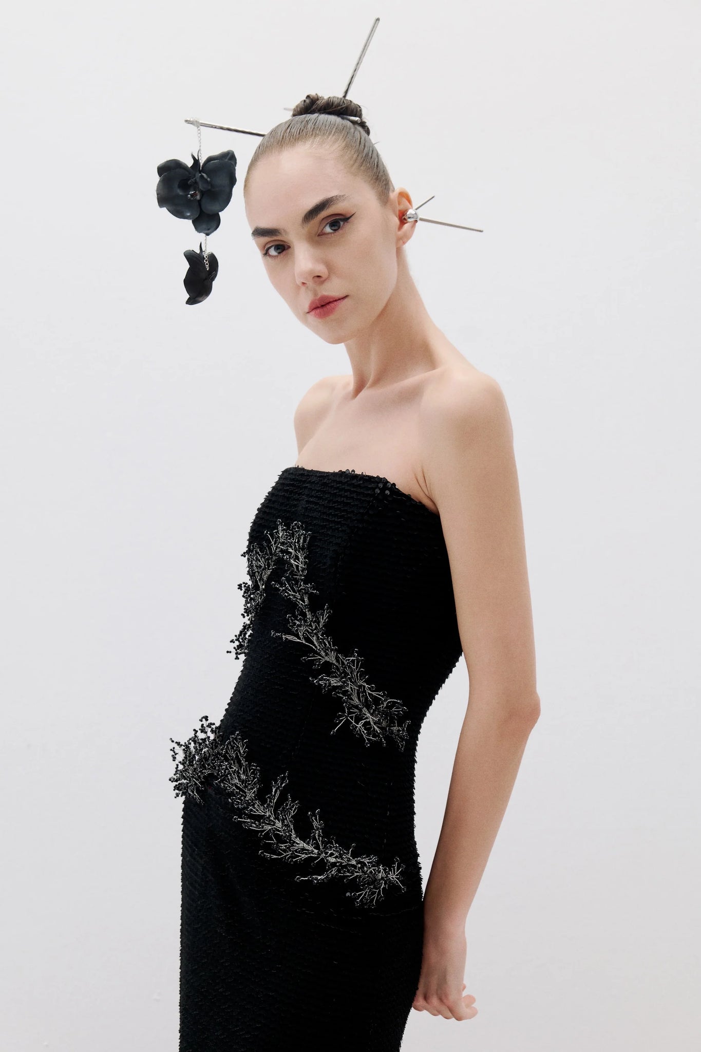 A strapless dress made from a velvet fabric with sequins, featuring an accessory detail made of branches on the upper part. The back has a zipper closure.