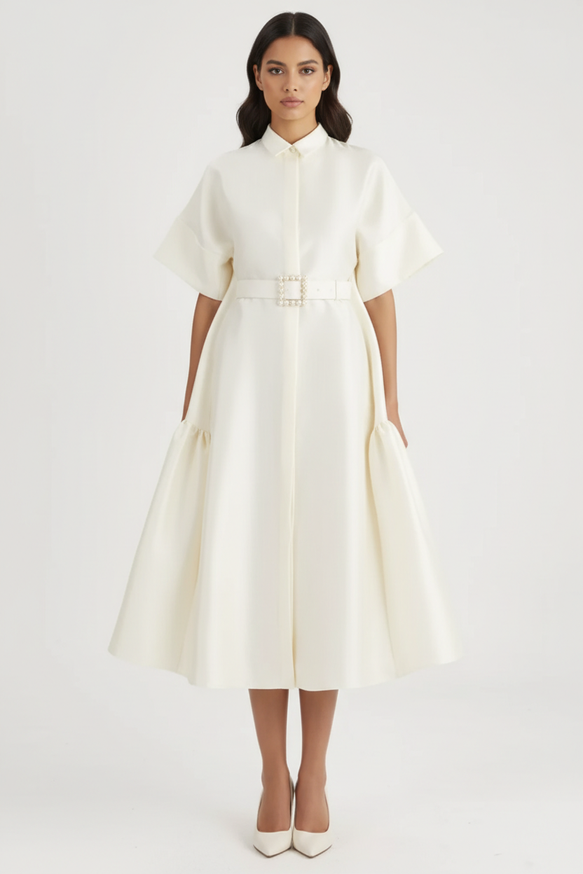 A shirtdress that’s equal parts stylish and comfortable. This midi piece features Kimono sleeves and is secured with concealed buttons. The bottom is adorned with gathered ruffle details that add that extra poof. A fabric belt with a pearl buckle enhances the silhouette.