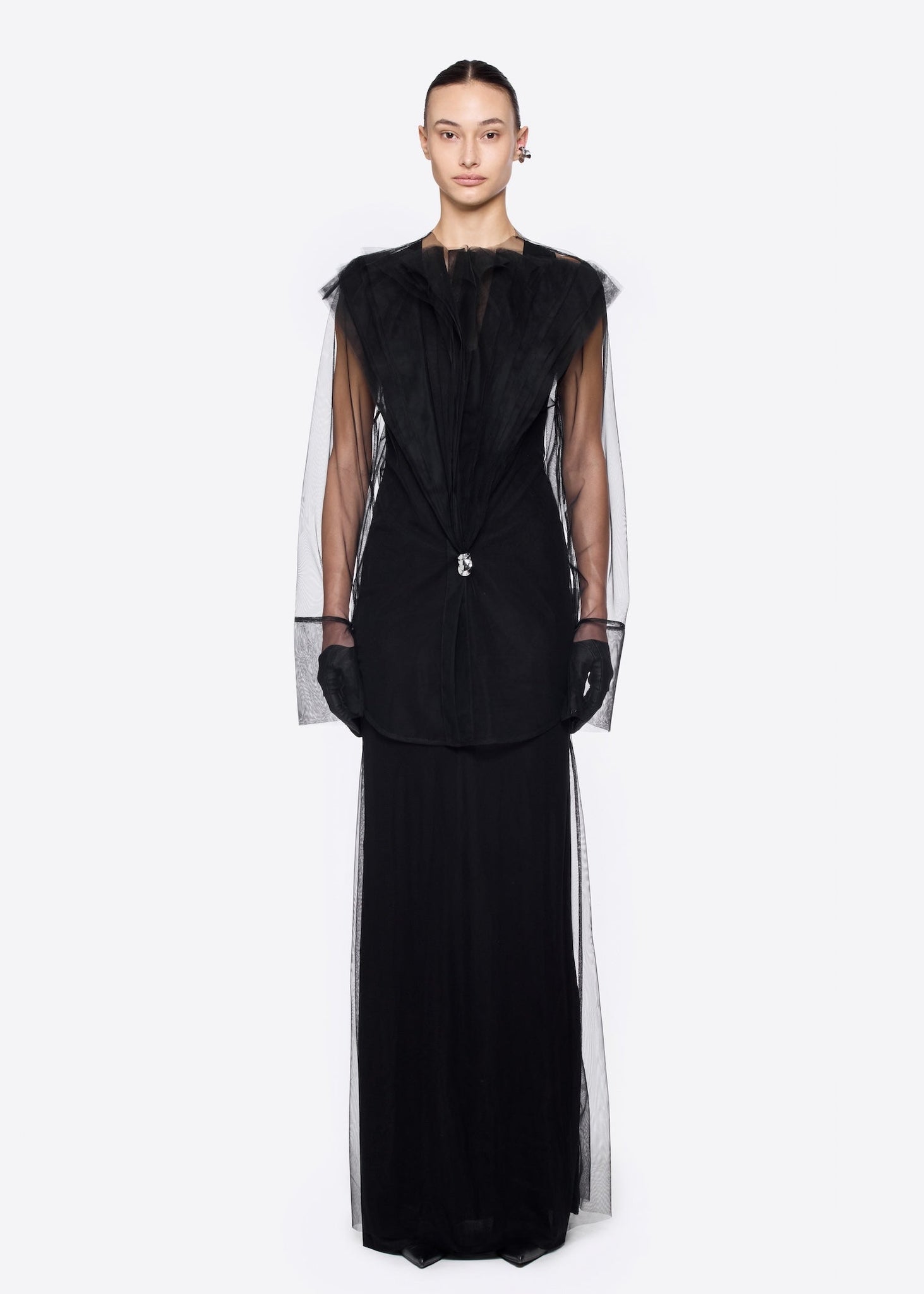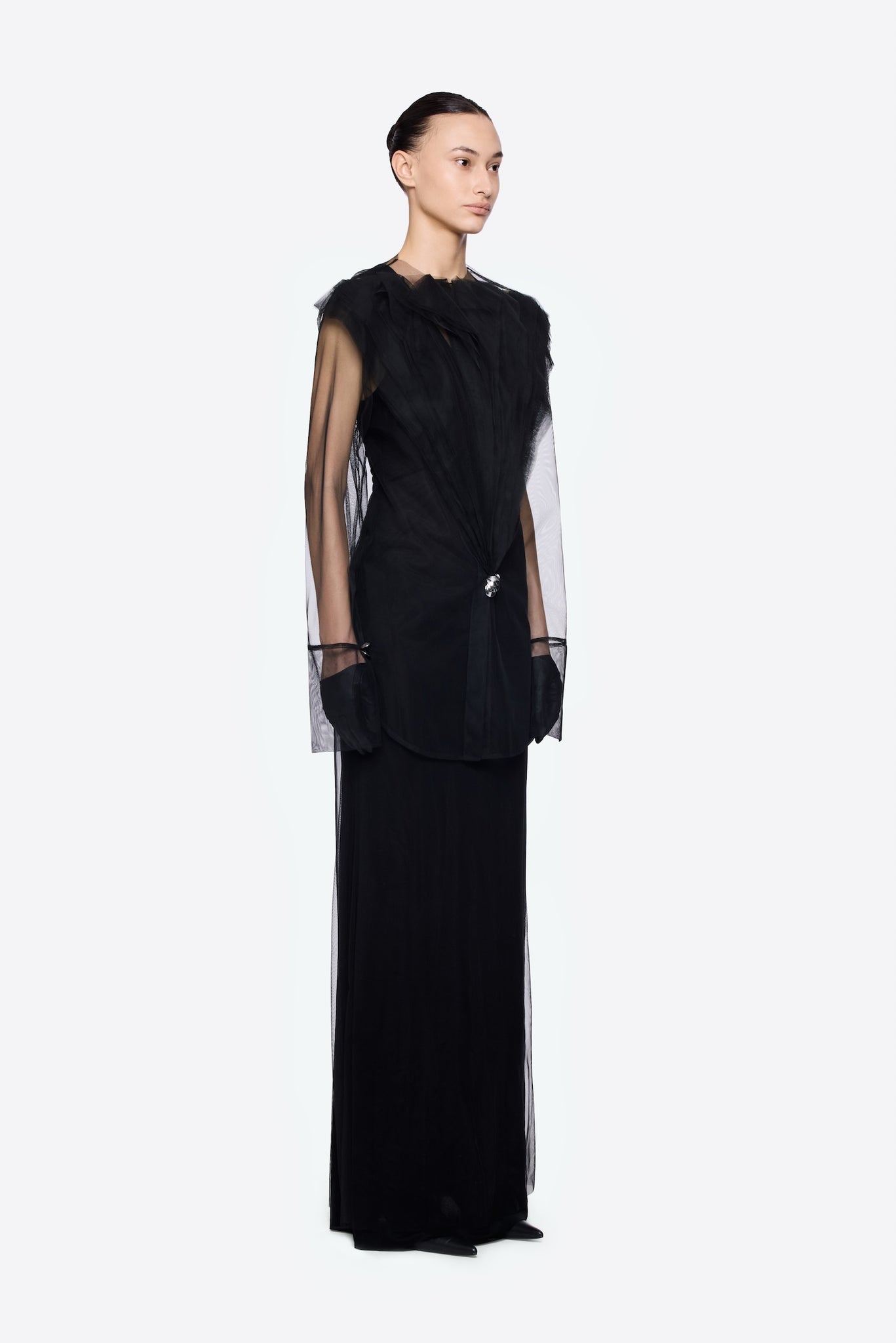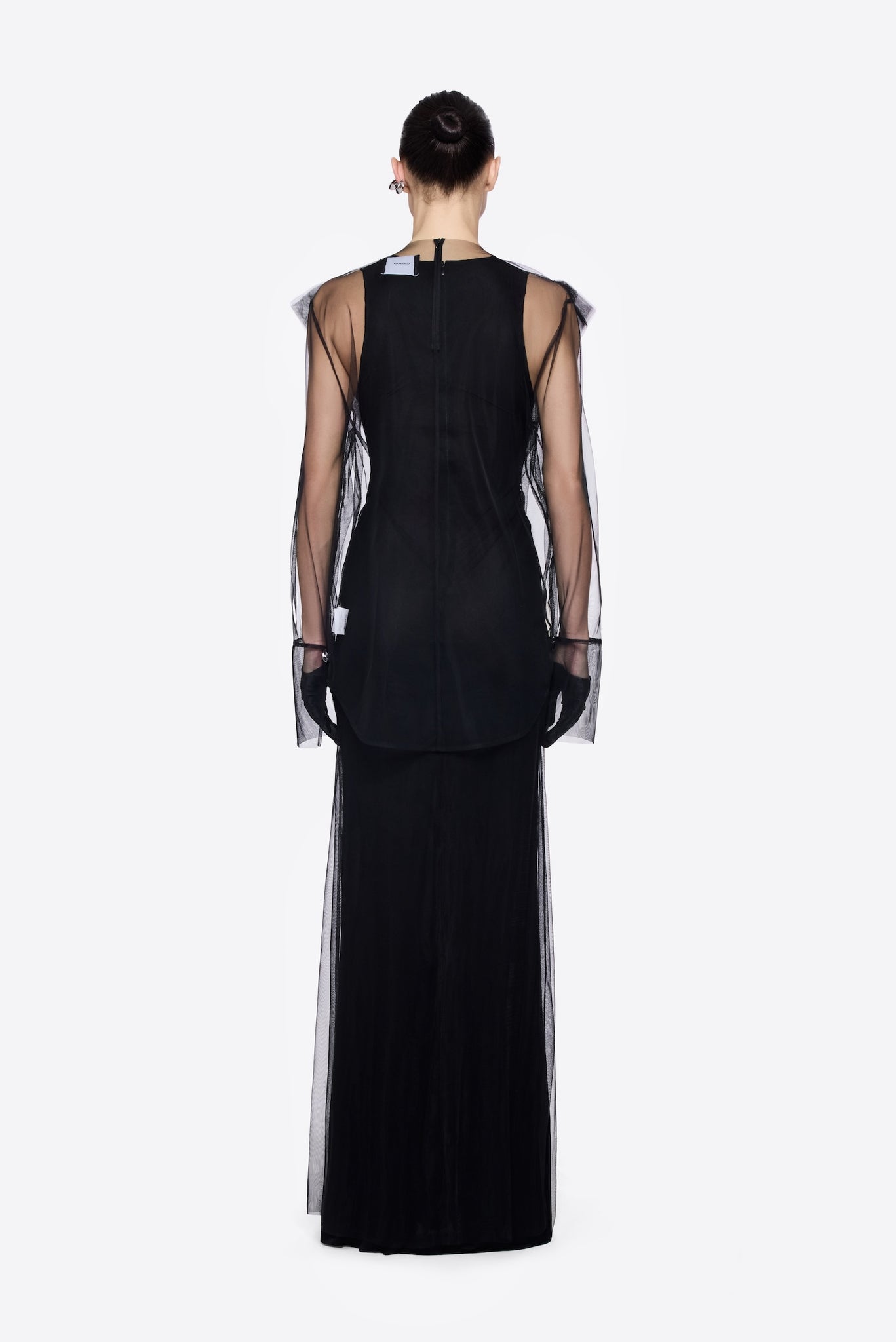 Form-fitting dress with layered sheer cover and Loose-fit shirt with triangular shaped sheer module and metalic detail