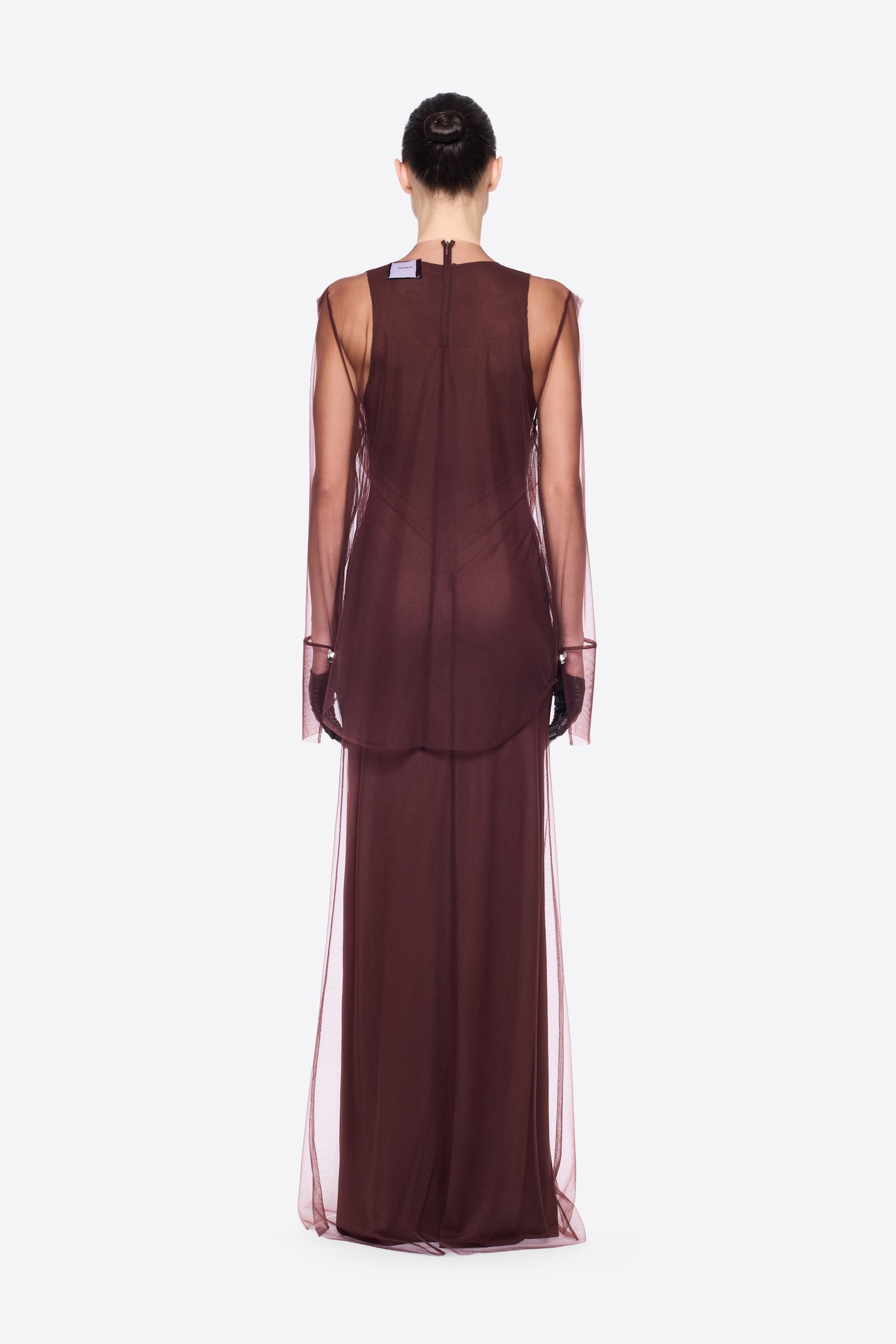Form-fitting dress with layered sheer cover and Loose-fit shirt with triangular shaped sheer module and metalic detail