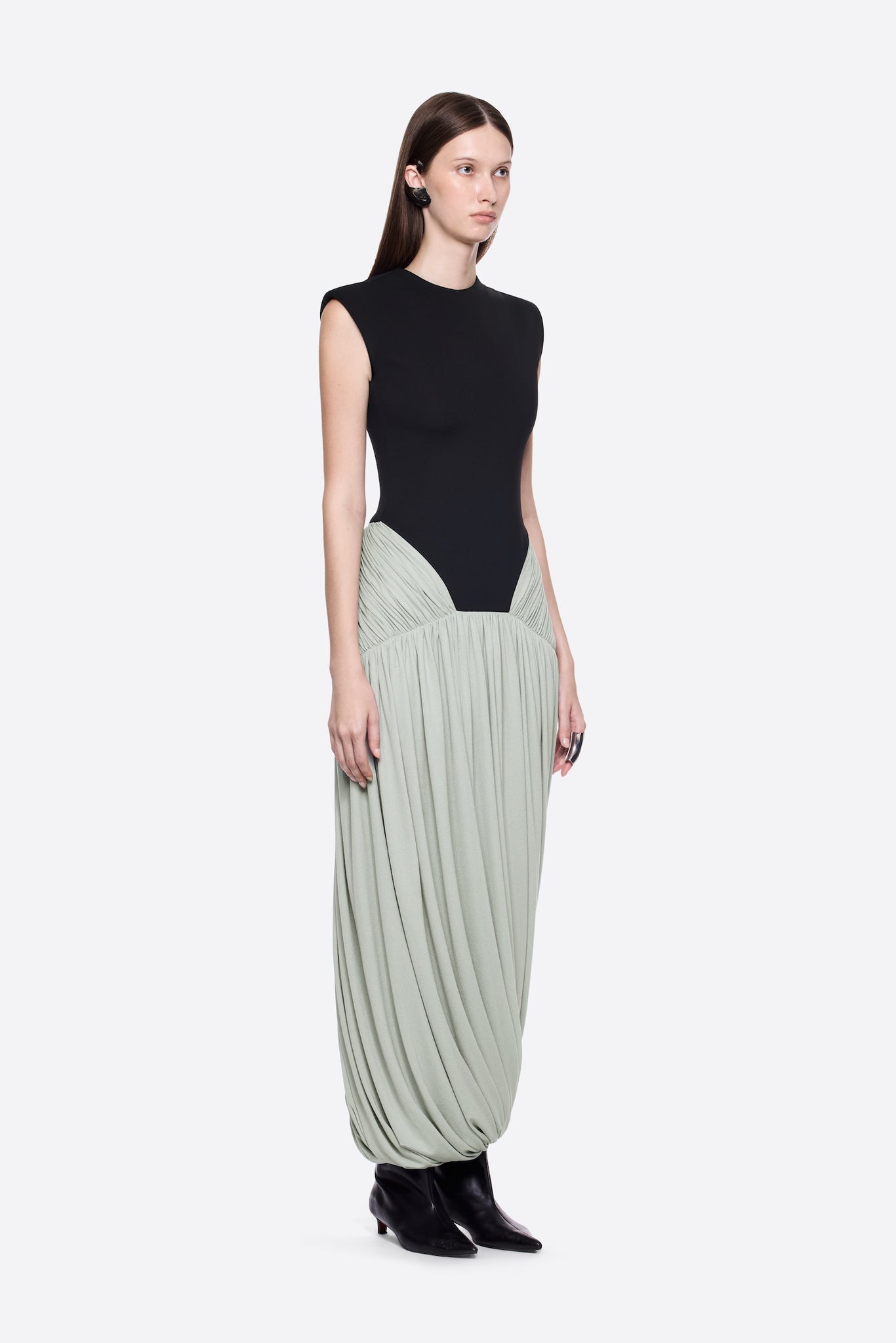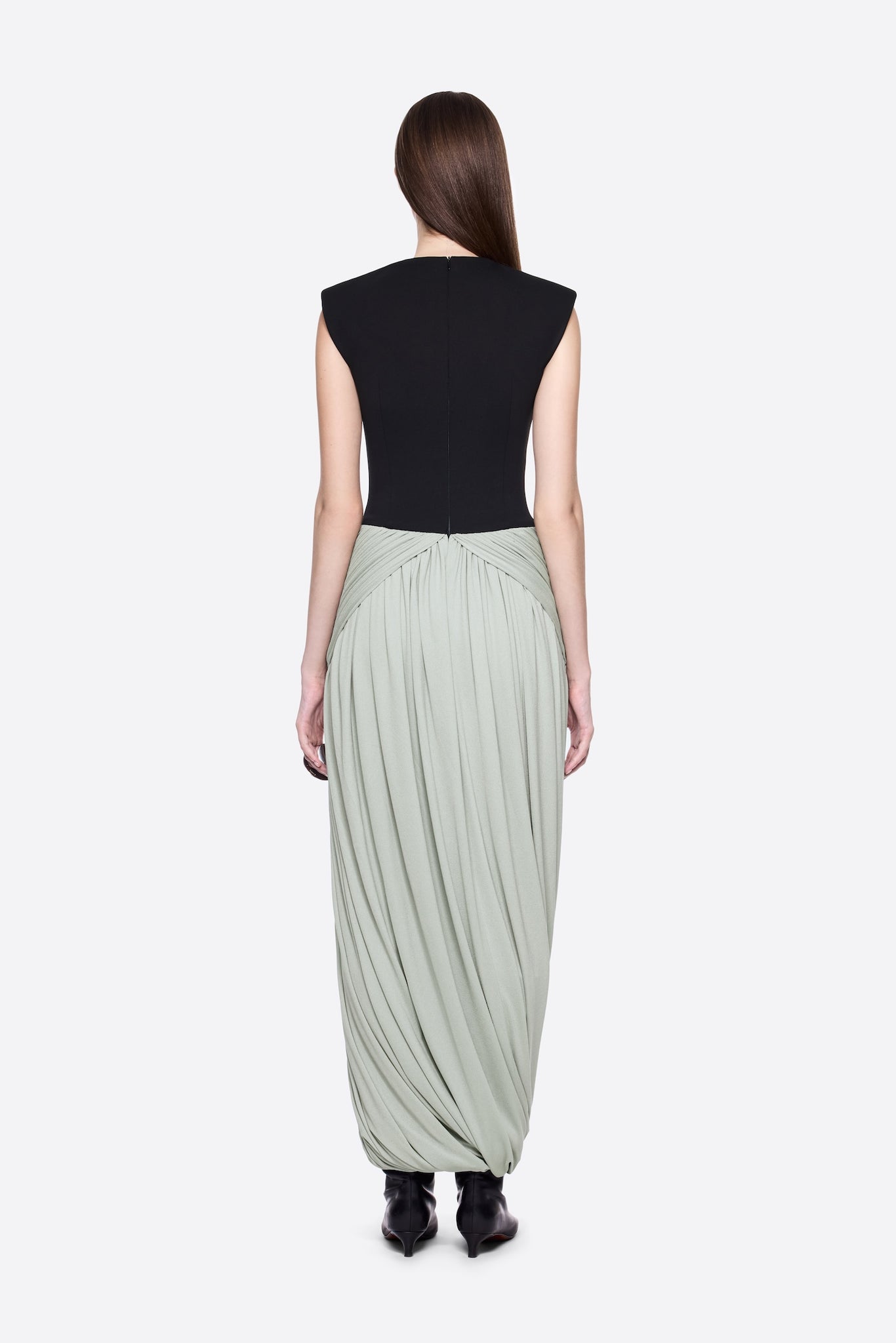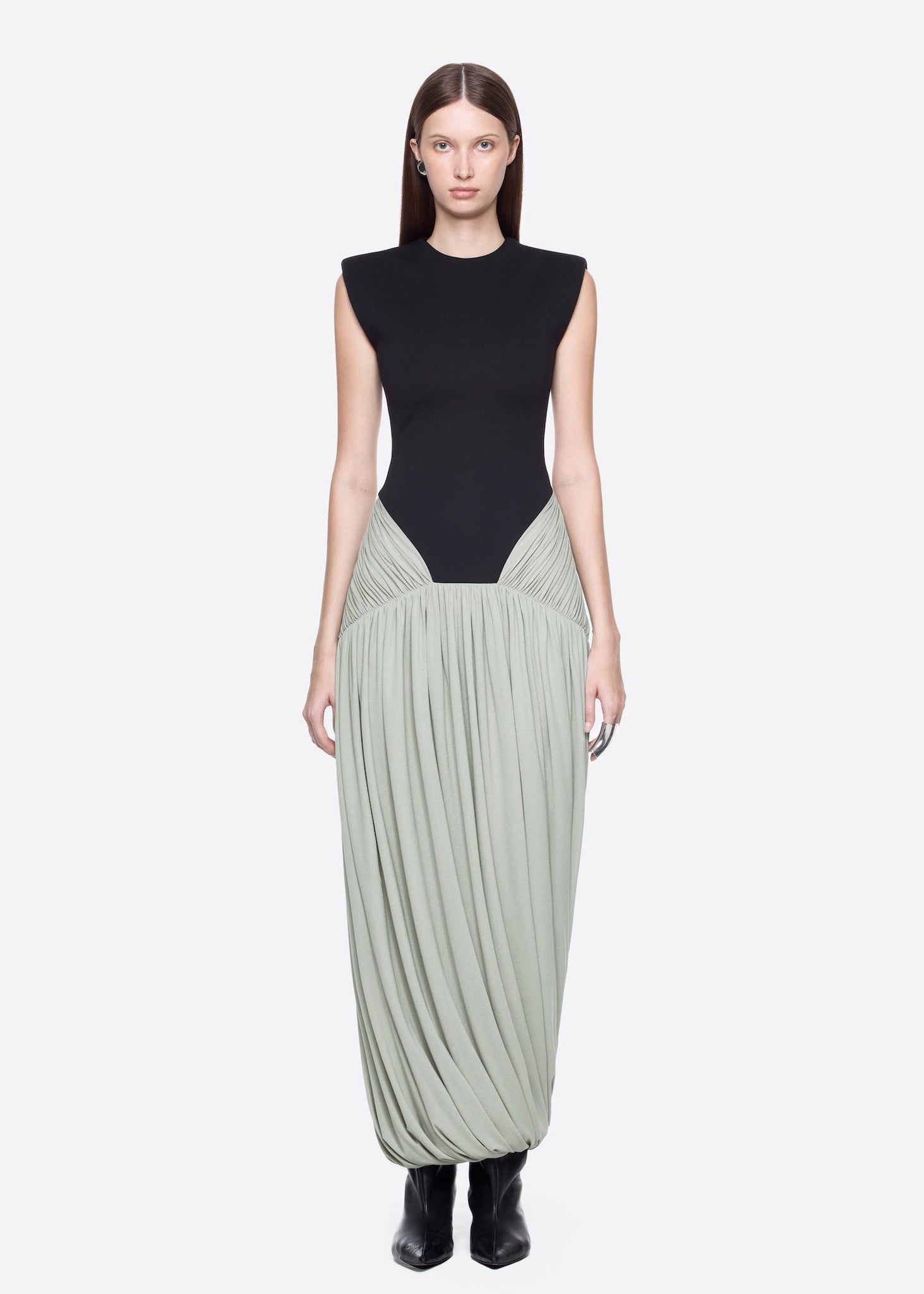 – Detail: Symmetrical draping details at hip, Circular twisted skirt, Padded shoulders, Sleeveless