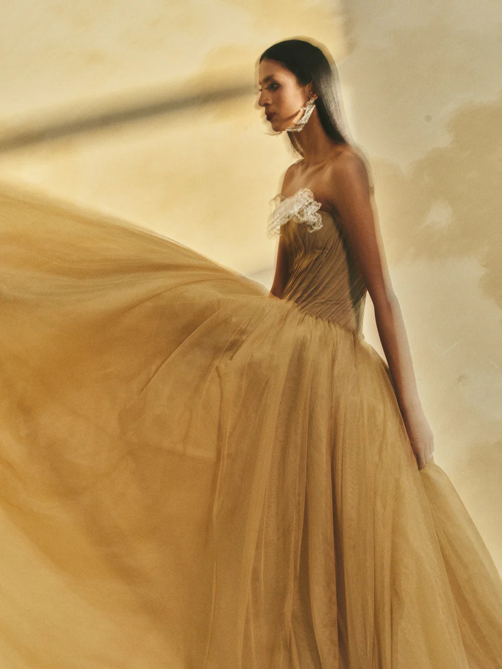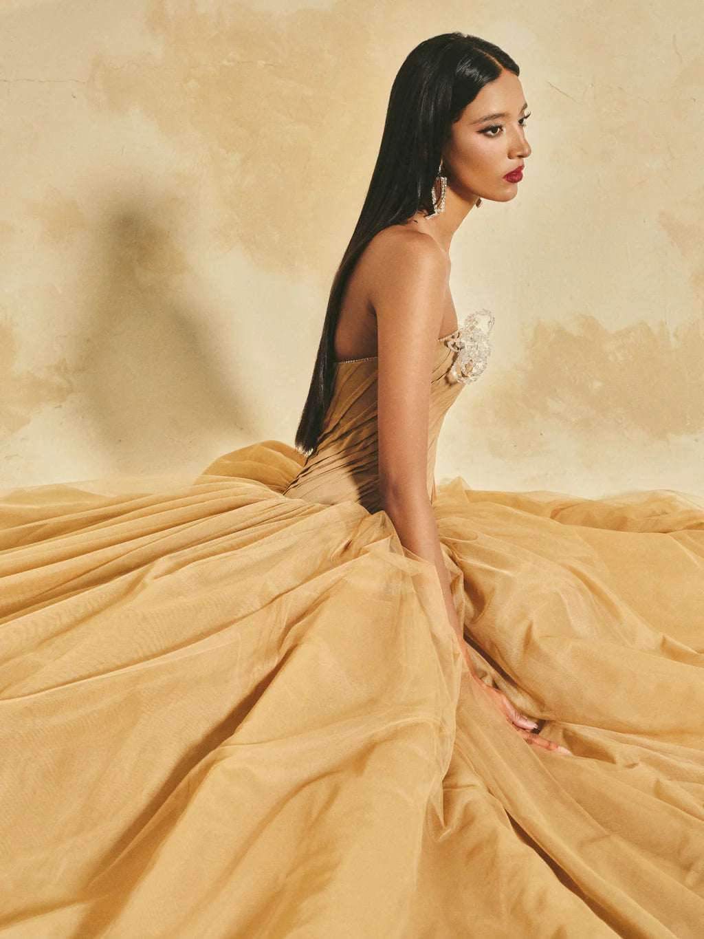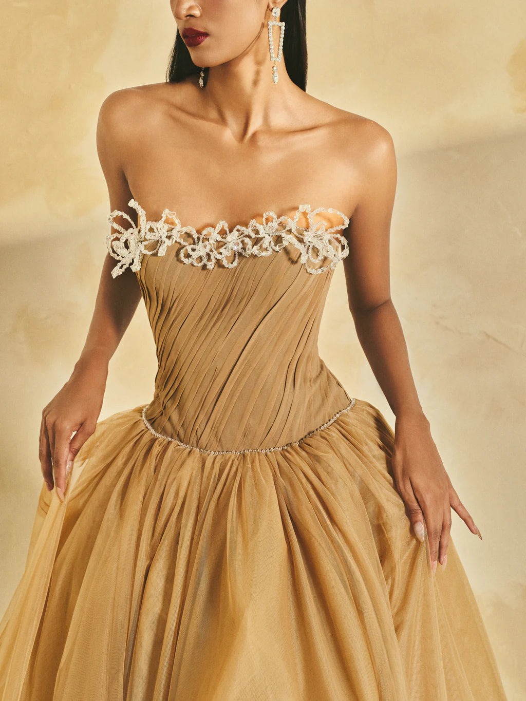 Off-shoulder flared maxi dress featuring a softly contoured neckline. The bodice, crafted from sheer chiffon, is meticulously hand-pleated and adorned with crystal accents and handcrafted 3D crystal flowers along the neckline.