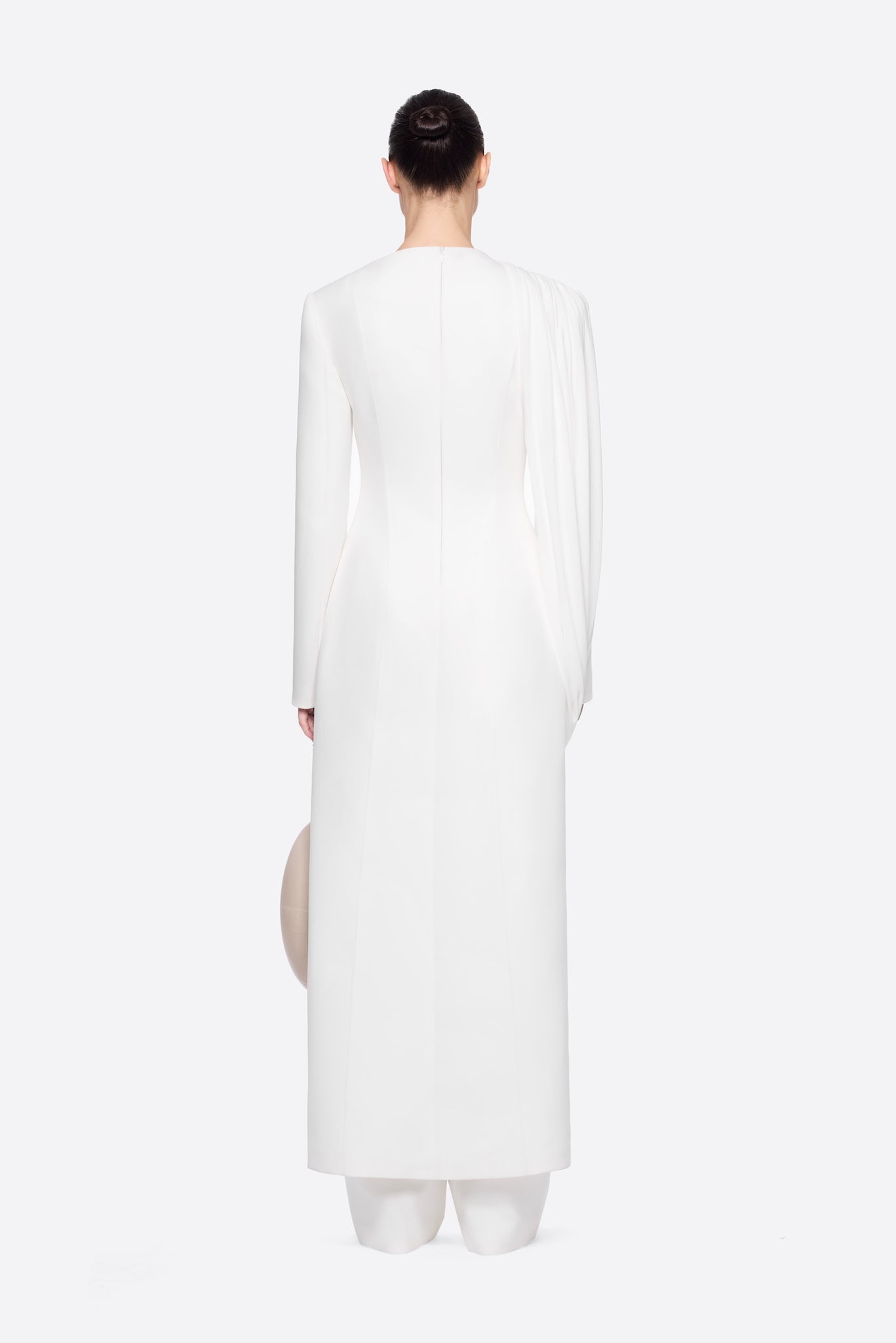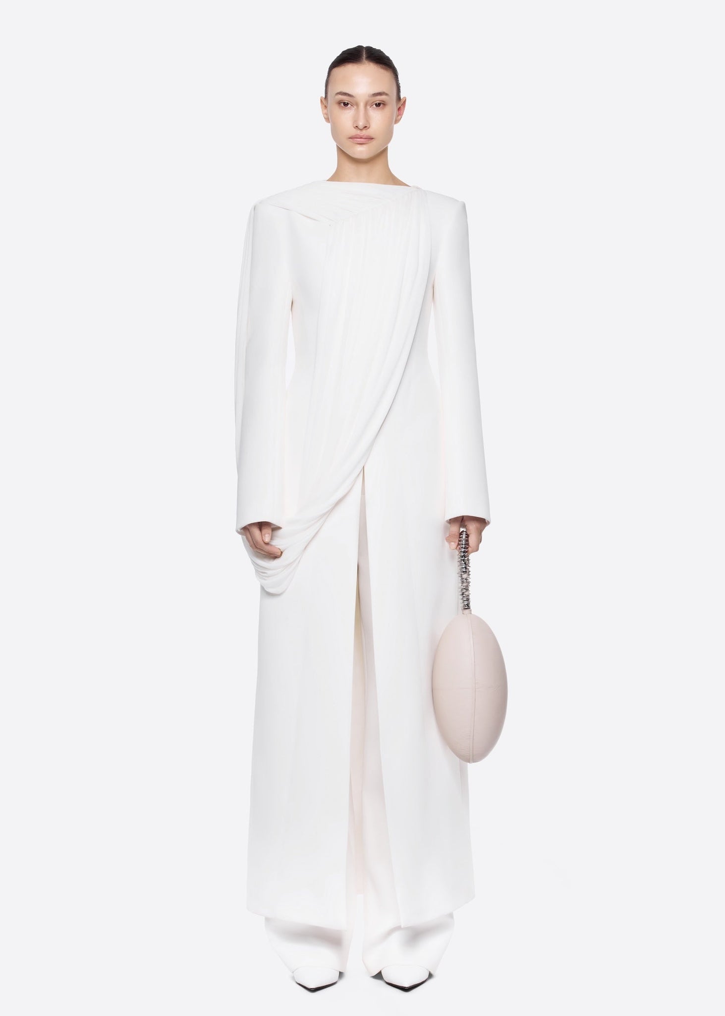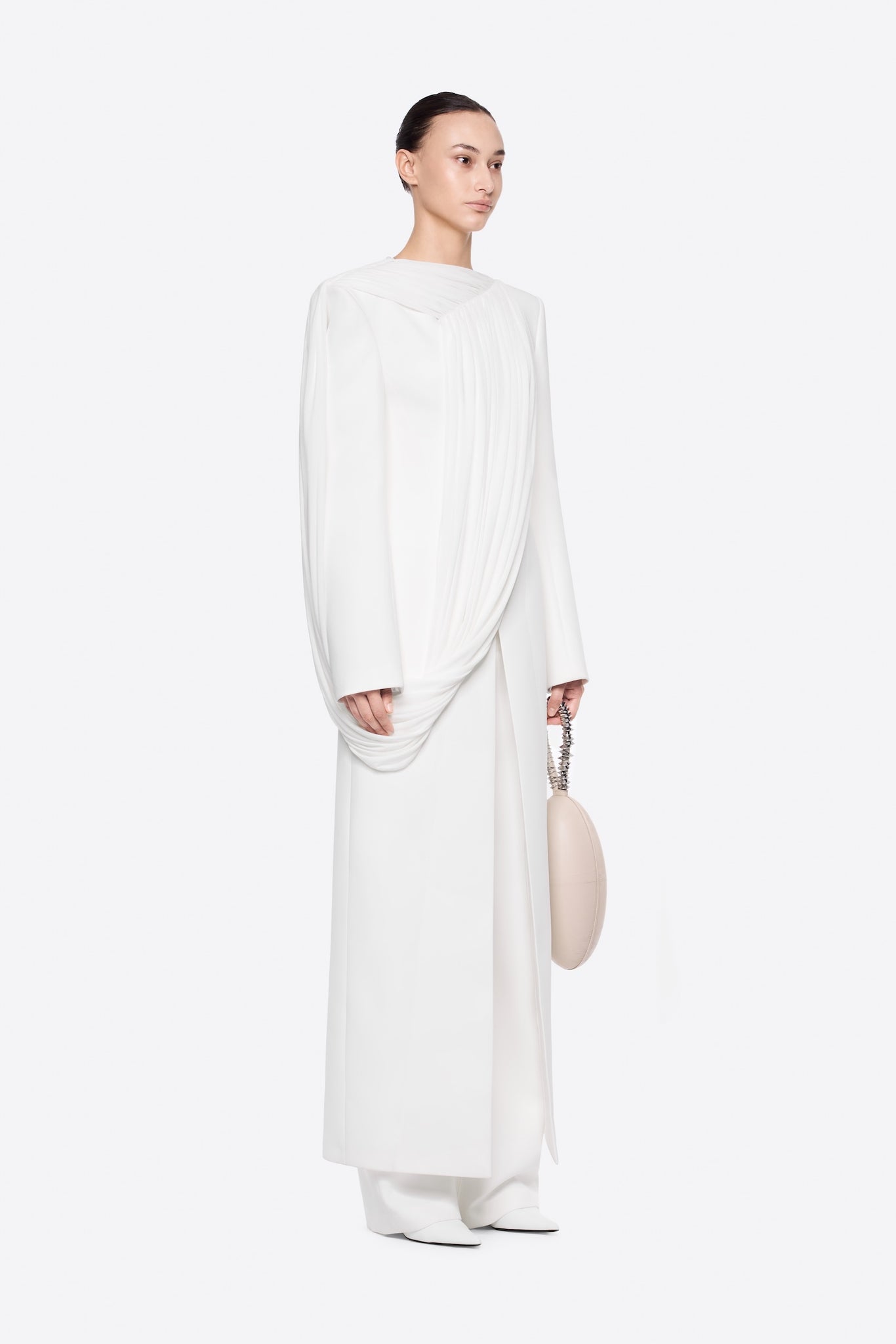 Form-fitting coat with shoulder-crossed draping details and symmetrical raised stiches
