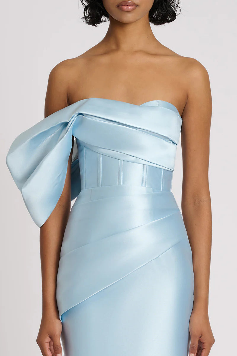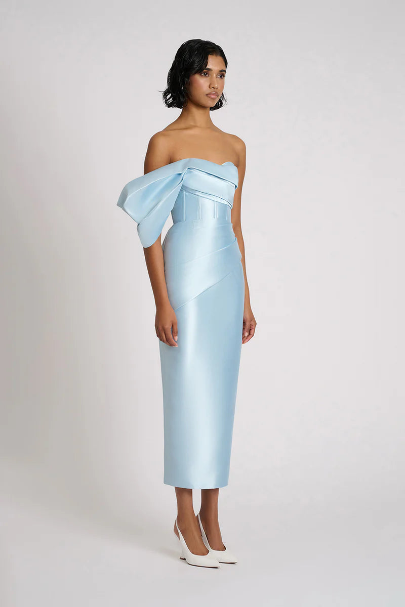 a chic midi-length that has an off-the-shoulder one-sleeve design and boning for added structure. Featuring elegant pleated detailing and crafted from premium Mikado fabric, the Maisie Dress is complete with an invisible zipper and a back split at the centre back for a sophisticated look.