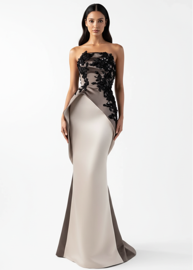 Strapless dual-tone gown in creamy and anthracite satin razmir, featuring sculpted hips and floral appliqué on the bodice. A masterclass in shape and contrast.