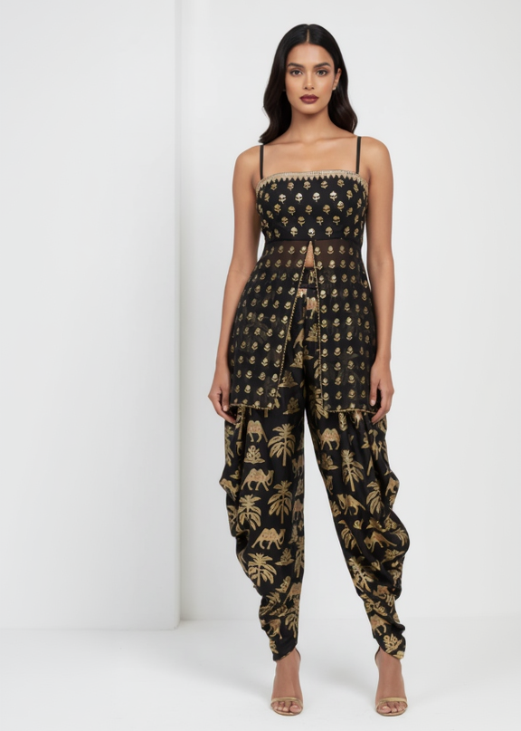 Details: This Black Fusion Set comes with sheer Peplum which has contrasting bodice adorned with aari embroidery in the front & Wallflower print at the back and is edged with kinari which adds oomph factor to your figure! Cowl pants has a beautiful Oasis foil print & is edged with kinari.