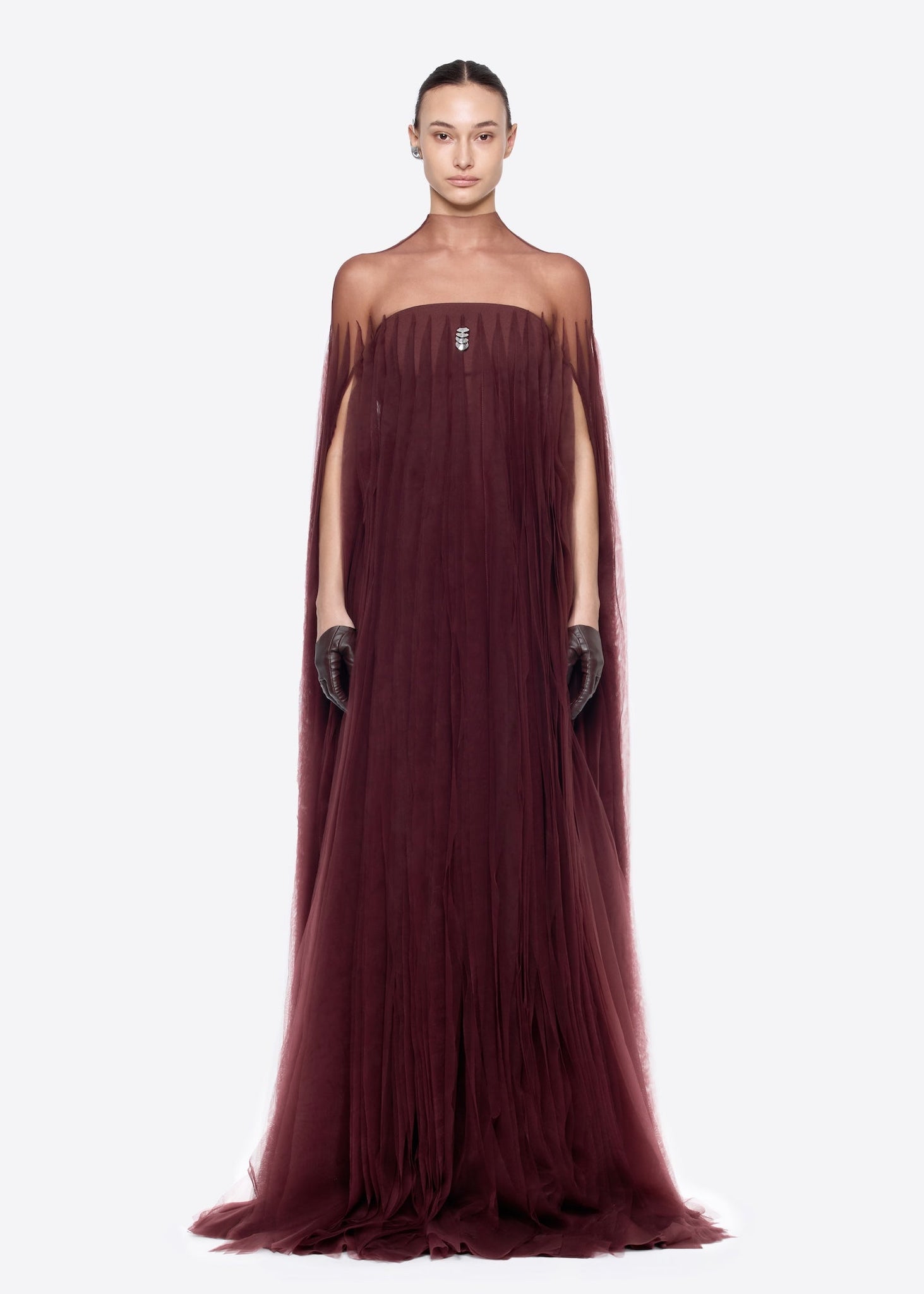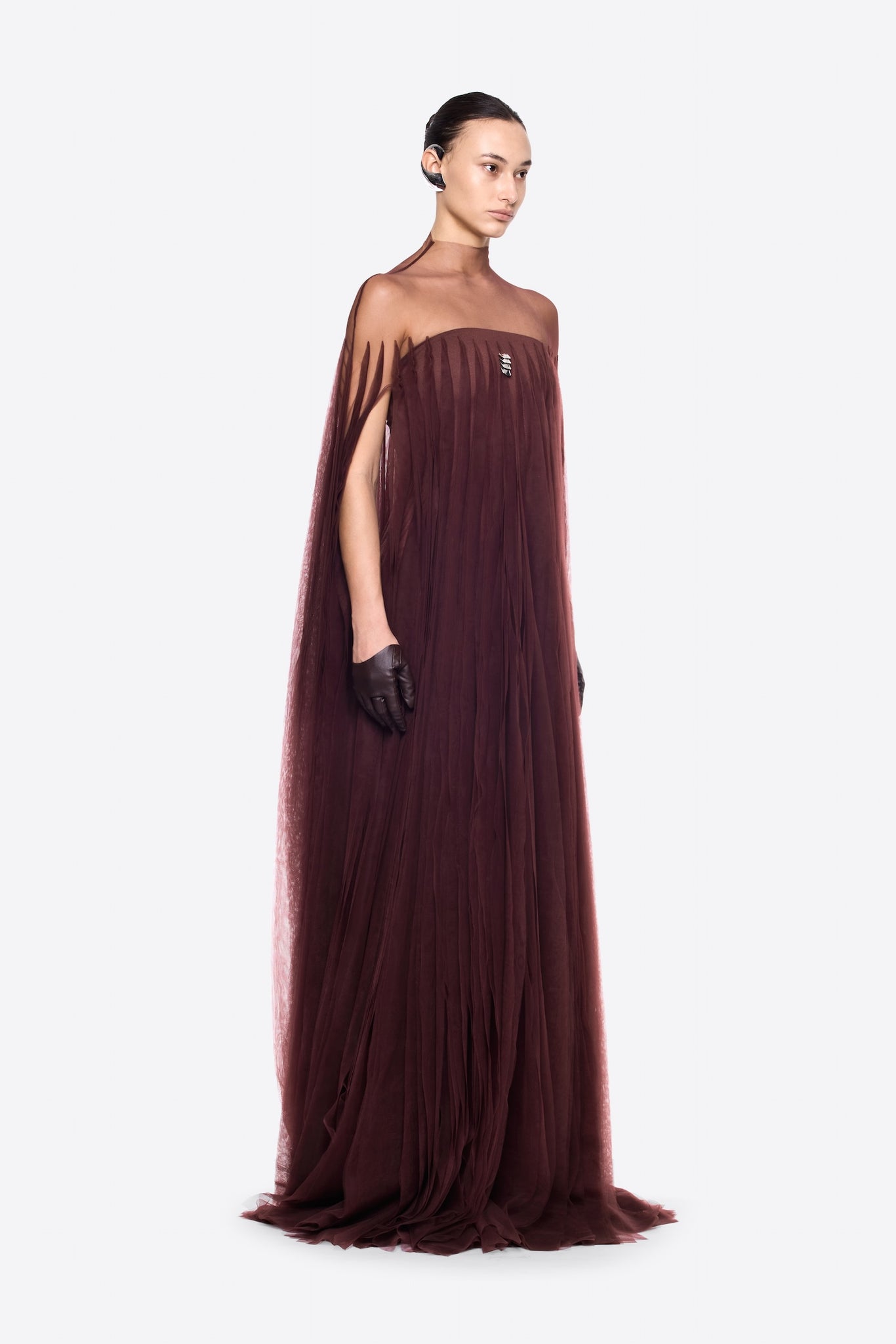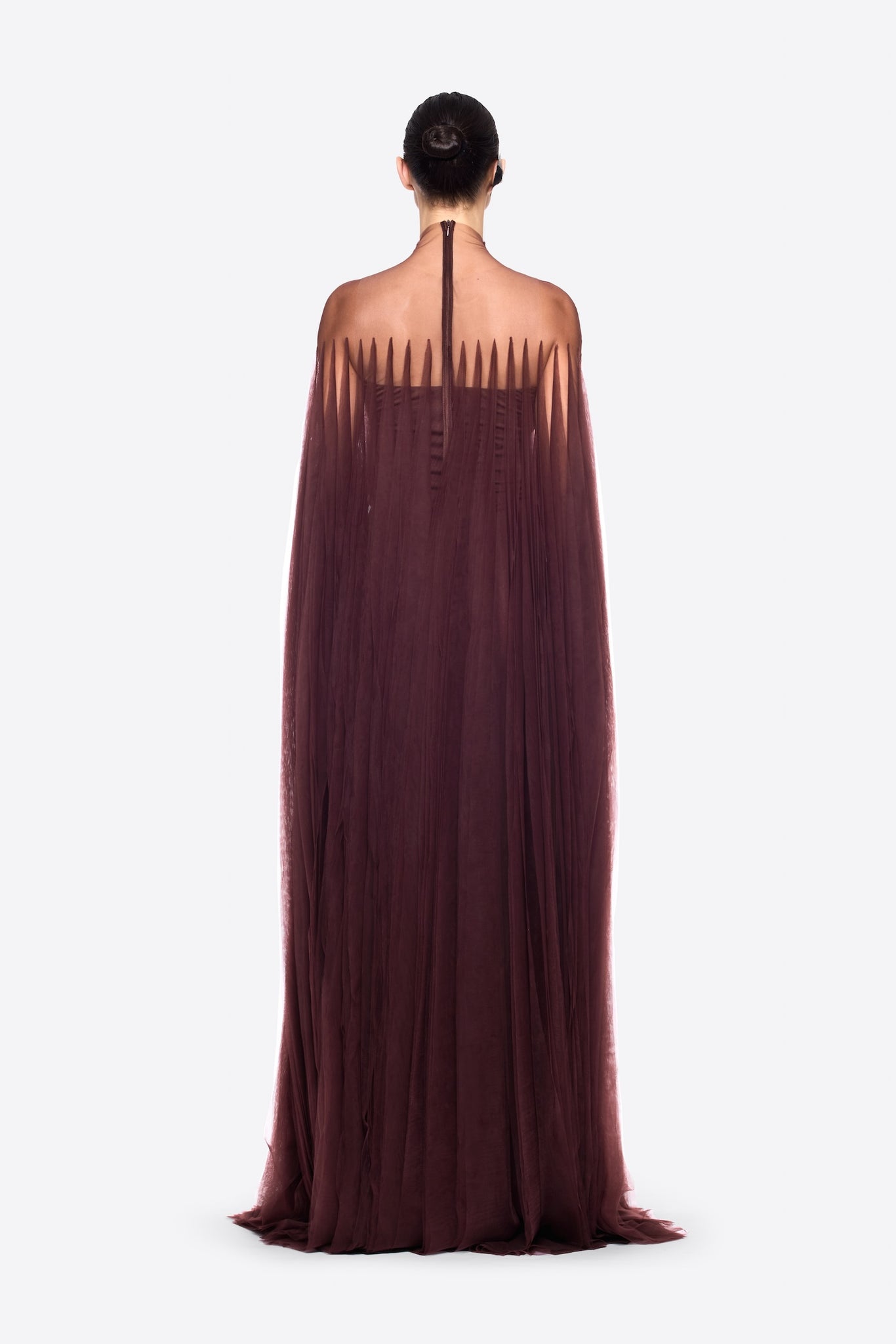 Long Stretch Crepe Knit dress and Loose-fit long triangular sheer cape with metalic detail